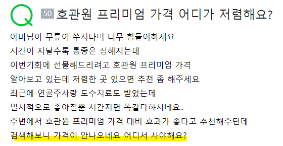 궁금해서 이것저것 검색하다 보니 호관원 프리미엄 골드는 판매하는 곳이 많지 않기 때문에 이렇게 인터넷포털 사이트에서 사람들에게 질문을 남기는 사람들이 많더라고요. 가장 최신글로 확인해서 가져왔습니다.
